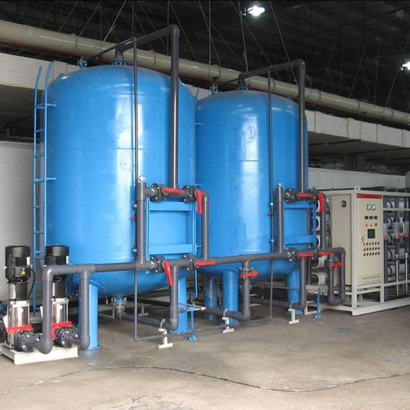 原水經(jīng)過增壓泵加壓后進(jìn)入石英砂過濾器,主要去除水中的泥沙、鐵銹、紅蟲及藻類等固體物質(zhì),系統(tǒng)設(shè)置兩套石英砂過濾機(jī),正常運(yùn)行條件如下:平均過濾速度為3M/h,壓力不大于4.5kgf/cm2。內(nèi)壁籿膠,碳鋼材質(zhì)。